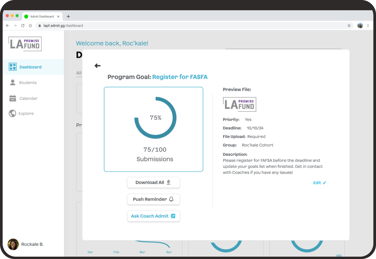 Provides administrators with a centralized hub to oversee student progress, goal completions, and engagement metrics.
