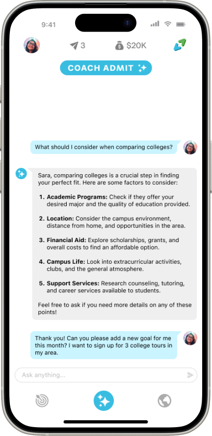 A high school junior juggling multiple college application deadlines. She needs to stay organized with clear goal tracking and personalized guidance.